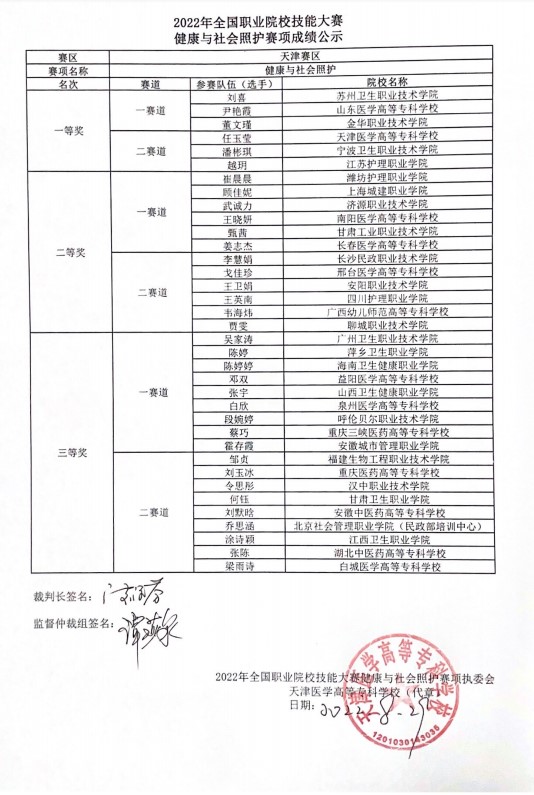 本次赛项于2022年8月26-28日在天津医学高等专科学校举行,吸引了来自全国28个省、自治区、直辖市的60个院校、60支代表队的选手和指导老师参赛。全国职业院校技能大赛高职组健康与社会照护赛项共分为两个赛道,每个赛道设个人一、二、三等奖,获奖比例分别为 10%、20%、30%,获得一等奖参赛选手的指导教师将由大赛组委会颁发优秀指导教师证书。